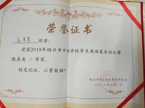 喜讯!6月1日下午,绍兴护士学校学生赵寒雪在2018年绍兴市中职学校学生英语基本功比赛中喜获二等奖,指导老师为我校英语教研组组长寿柳娣老师。